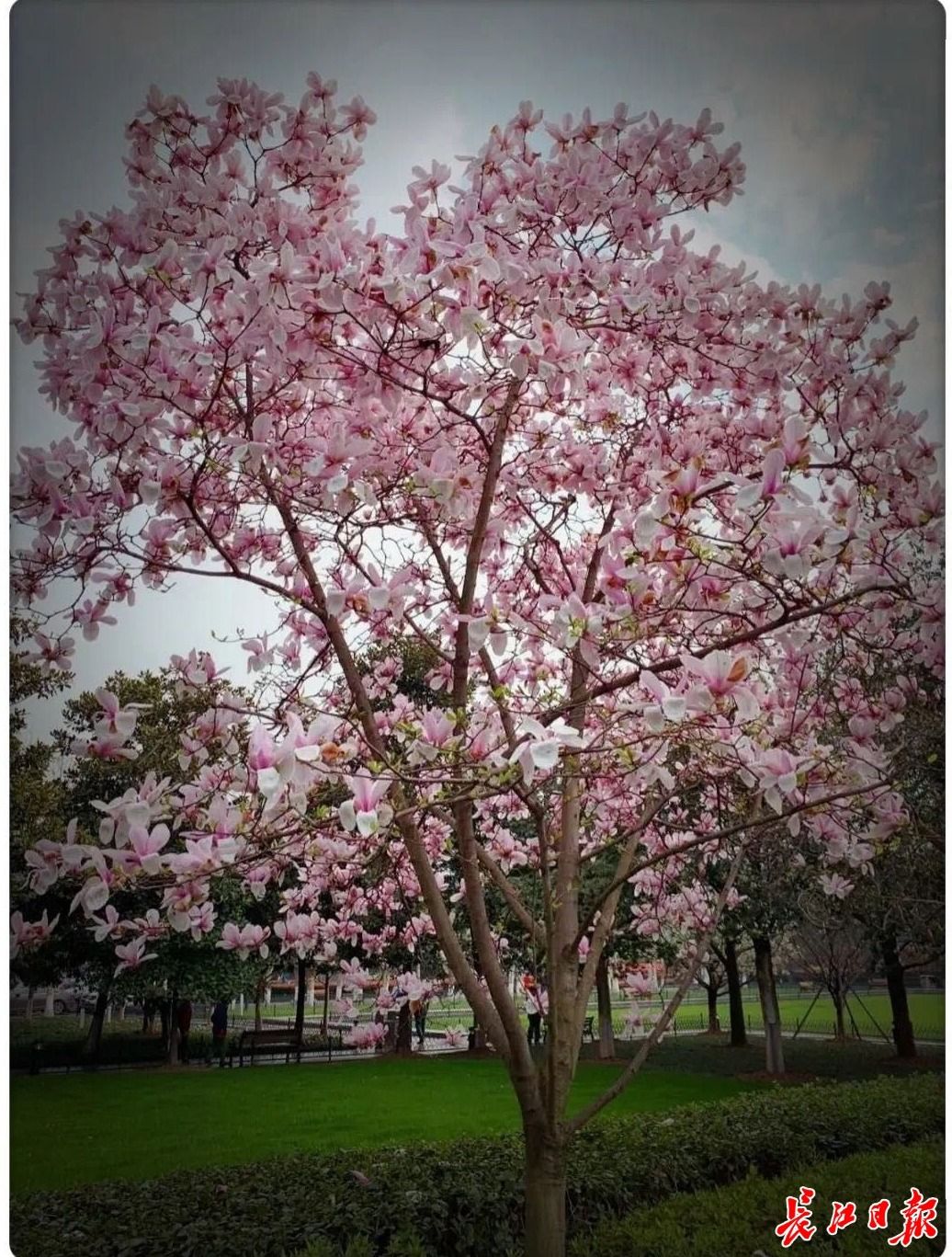 首义广场的工作人员张巍去年春天时拍摄了一张照片:广场北区的一株玉兰花,静静独放,美成一幅画。22日,他在公园巡视时又拍下了这株树,同样的满树繁花,但不同的是,树下游客来来往往,不少游人被这株美丽的树吸引了目光。“去年春天,满园花都开了,但是无人实地欣赏。今年春天广场里每天都游人如织,看到大家赏花开心,我们也十分高兴。”张巍感叹。