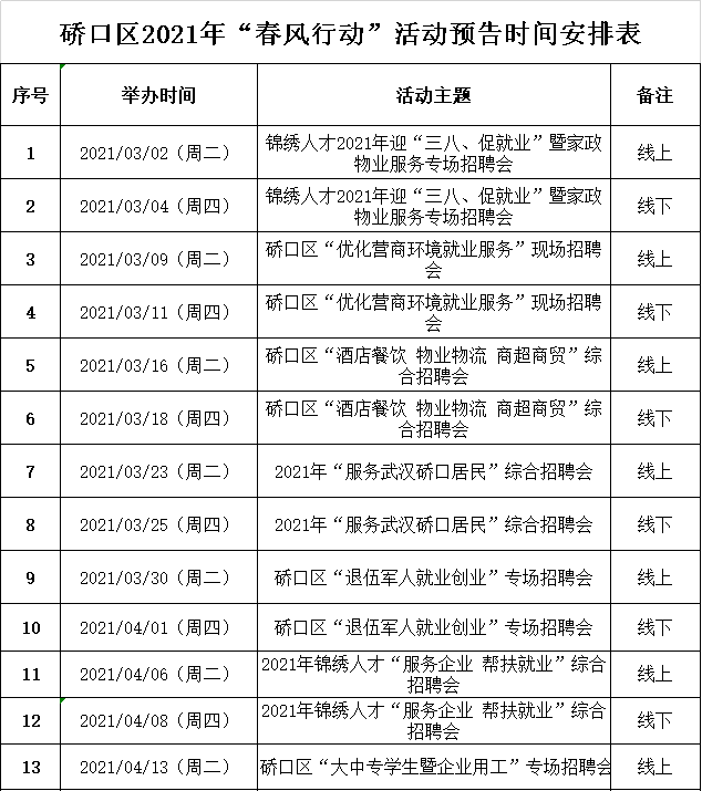从2月23日至4月13日,硚口区开展15场“春风行动”,线下举办7场综合招聘会,既有家政服务、酒店餐饮、物业物流、商超商贸等行业专场,也有退伍军人和大中专学生等群体专场,将满足广大居民现场咨询、了解、比较岗位的需求。
