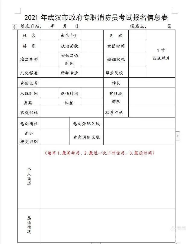 报名资料:本人身份证、户口簿、退伍证、学历证和相关技能证书的扫描件或清晰照片、近期蓝底免冠彩照电子版、《2021年政府专职消防员报名信息表》电子版发送邮箱369951435@qq.com