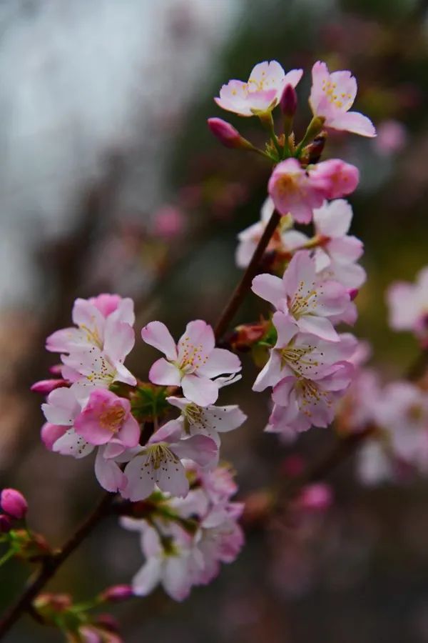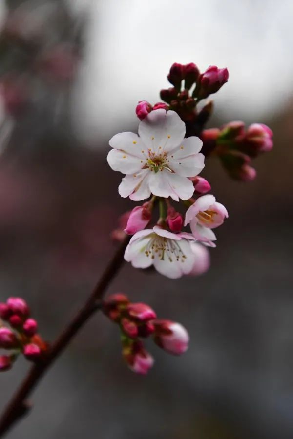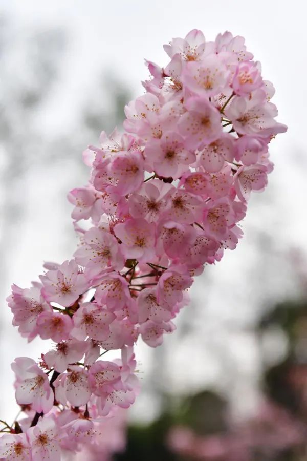 花色为浅紫红色,花量也很大,花期比楚红早2~3天。一个花序最多可以开花13朵,而日本栽培的品种染井吉野,一个花序只开3~5朵。花体呈颜色不一的樱花棒状,也是乔木,树形犹如高架酒杯。