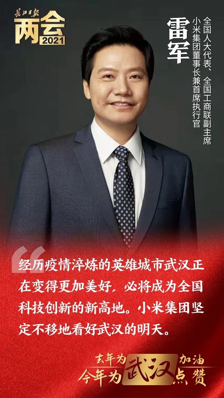 今年两会期间,雷军为武汉点赞,他说,经历疫情淬炼的英雄城市武汉正在变得更加美好。武汉科教资源丰富,营商环境优越,必将成为全国科技创新的新高地,小米集团坚定不移地看好武汉的明天,坚定不移地助力武汉经济社会发展。