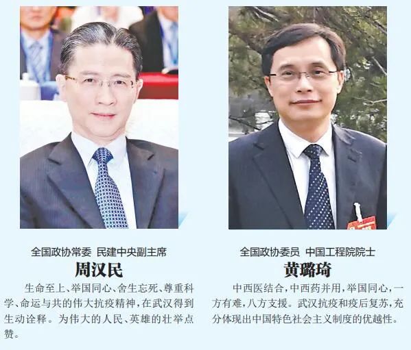 大年初一率首支国家中医医疗队奔赴武汉的全国政协委员、中国工程院院士、中国中医科学院院长黄璐琦,全国人大代表、浙江省人民医院院长、浙江第五批援鄂医疗队队长葛明华,全国政协委员、曾在武汉抗疫一线奋战2个多月的北京医院呼吸科教授孙铁英等代表委员,也一直通过各种渠道关注着武汉的消息。今年两会期间,黄璐琦说:“武汉抗疫和疫后复苏,充分体现出中国特色社会主义制度的优越性。”葛明华则表示,经历了武汉保卫战,英雄的武汉人民将更加团结一致,武汉的明天一定会更美好,对武汉的现状和未来充满信心。