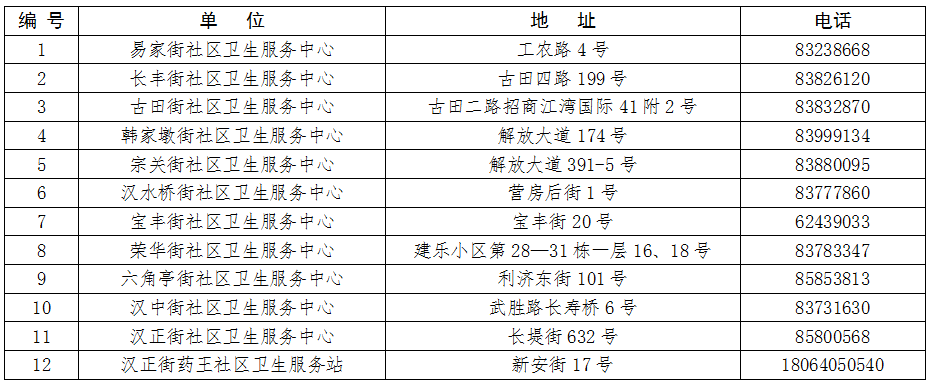硚口区11家社区卫生服务中心及汉正街药王社区卫生服务站(具体地址及联系方式详见附件1)。