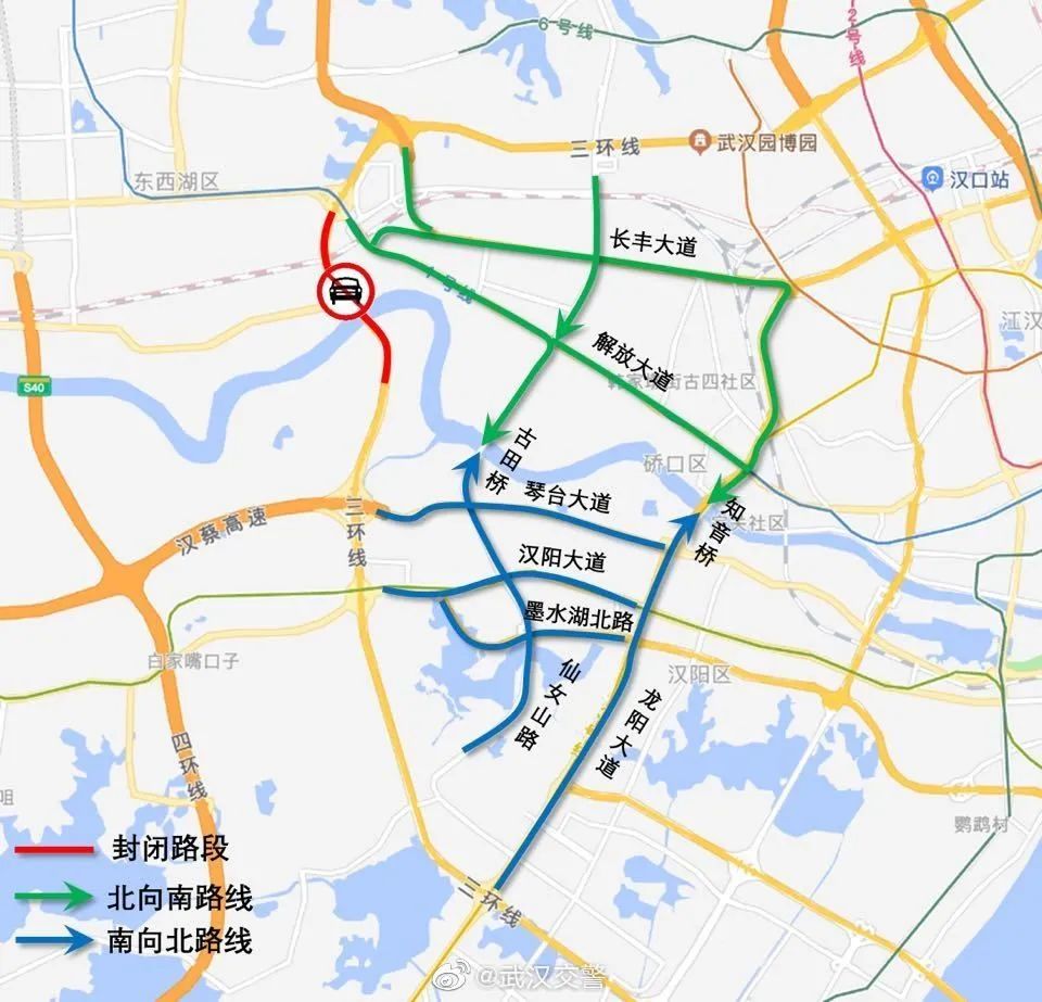 ③ 需绕行四环线的车辆可通过江城大道、徐家堡收费站、东风大道沌口收费站、汉阳大道、中法城收费站、汉蔡高速、长青收费站、东西湖大道。