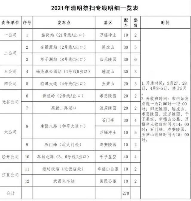 祭扫专线开收班时间为:市内始发点开班时间统一为7时至12时;归元陵园、睡虎山、孝恩陵园、流芳陵园、千子星空、幸福山公墓、万福净土、回民公墓收班时间为14时;石门峰、寿安陵园、玉笋山收班时间为15时。