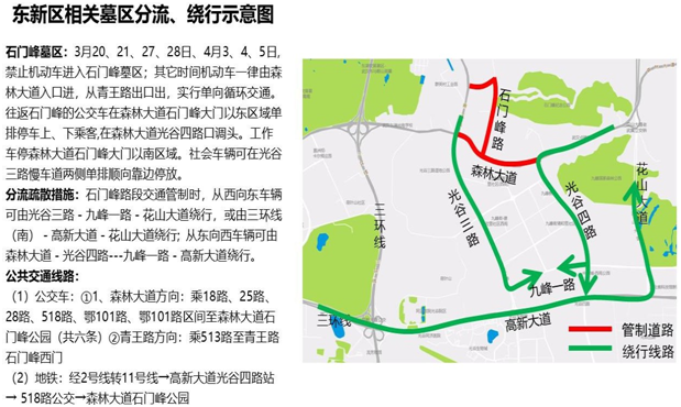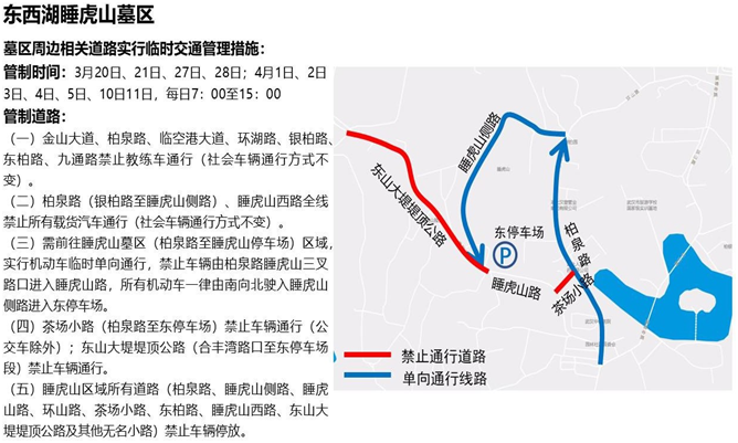 (三)需前往睡虎山墓区(柏泉路至睡虎山停车场)区域, 实行机动车临时单向通行,禁止车辆由柏泉路睡虎山三叉路口进入睡虎山路,所有机动车一律由南向北驶入睡虎山侧路进入东停车场。