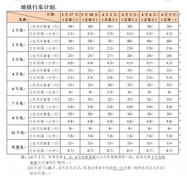清明期间,为方便市民祭扫,武汉地铁也调整行车组织方案:3月27日-3月28日、4月3日-4月5日,地铁4号线临时调整交路,改按单一大交路(柏林至武汉火车站)组织运营。