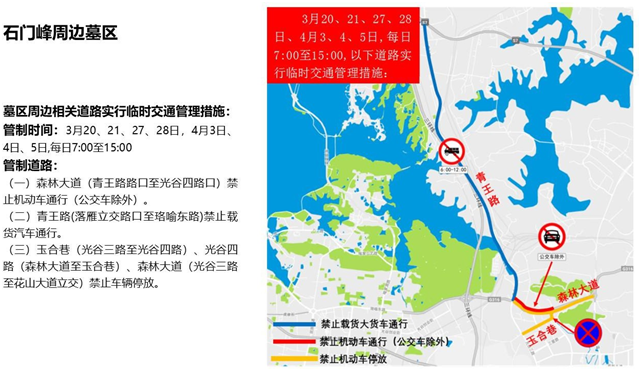 (二)幸福山公墓通道(天子山大道路口至幸福山公墓停车场)禁止机动车通行(公交车除外)。