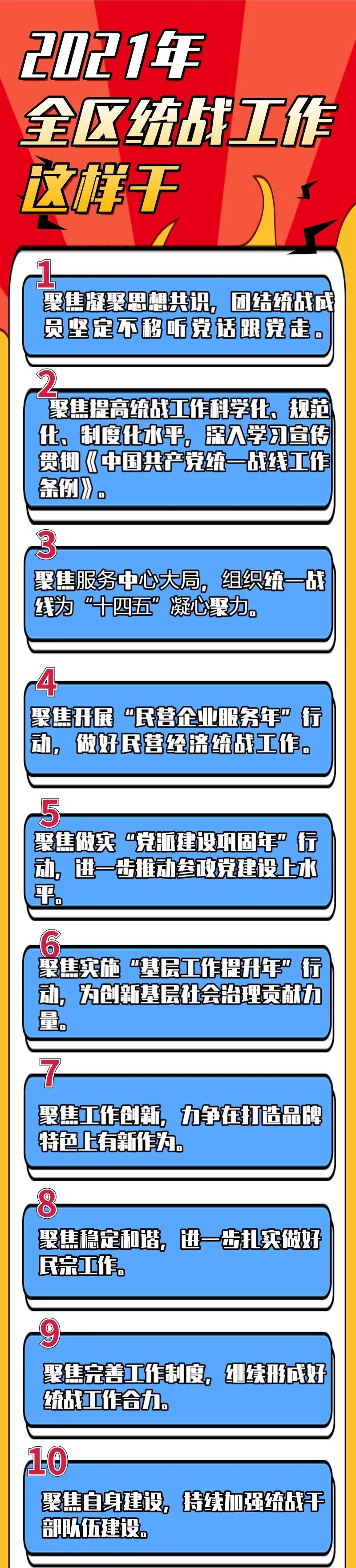 以习近平新时代中国特色社会主义思想为指导,全面贯彻党的十九大和十九届二中、三中、四中、五中全会精神及省委、市委、区委决策部署,以深入学习贯彻习近平总书记关于加强和改进统一战线工作的重要思想为主线,以学习宣传贯彻《中国共产党统一战线工作条例》为重点,以进一步发挥新时代统一战线法宝作用为目标,着力在思想引领、服务大局、风险防范、守正创新、固本培元、能力提升上下功夫,推动新时代统战工作高质量发展,为全力打造转型发展示范区、改革创新先行区、三生融合样板区,全面开启硚口复兴新征程作出新贡献,以优异成绩庆祝中国共产党成立100周年。