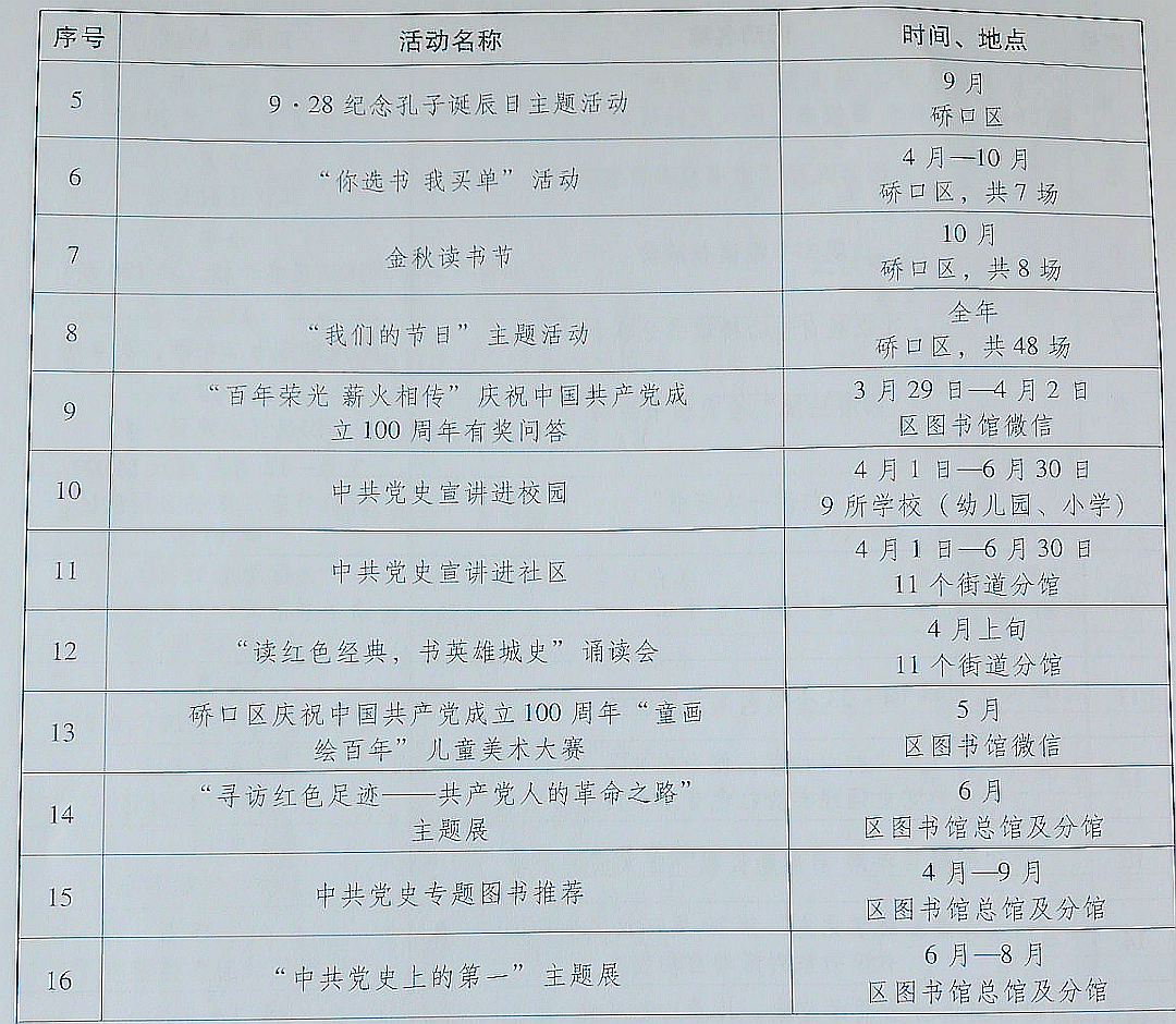 活动内容:围绕中国共产党建党100周年主题,在全区开展红色经典诗歌朗诵比赛、线上党史知识比赛,举办中共党史专题图书推荐、建党红色足迹、新中国诞生等专题展览……
