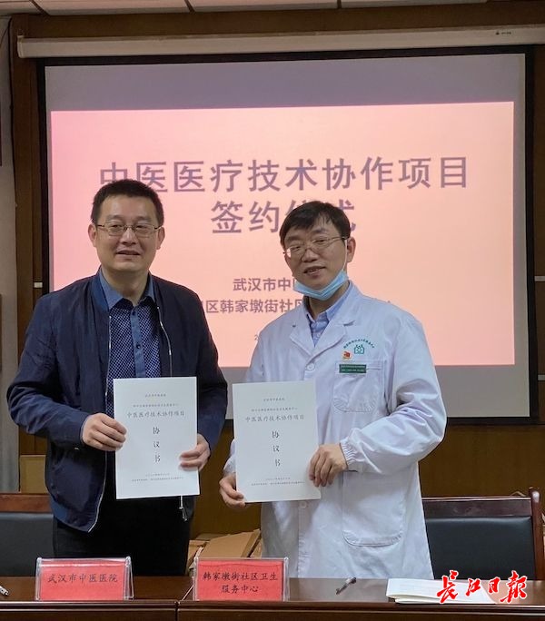 武汉市中医医院与硚口区韩家墩街社区卫生服务中心签订《中医医疗技术协作项目协议书》。通讯员 邹琪 摄
