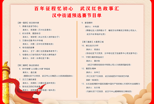 汉中街道讲解预选赛分为信念铸丰碑、身边的感动和大爱洒江城三个篇章,既有抗日战争中巧送鸡毛信的海娃、专替穷人打官司的共产党员大律师施洋这些耳熟能详的红色经典故事,又有深藏功与名的老英雄张富清、时代楷模“公交爱心大使”李福斌这些发生在身边的凡人善举;既讲述了父辈师友的家国情怀,又再现了面对新冠肺炎疫情共同抗疫的大爱无疆。