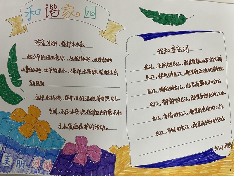 河岸边社区工作人员展示出了辖区内小朋友以“小手牵大手,保护美丽汉江”为主题的绘画作品。孩子们通过自己的画笔,画出了中心最美的河湖,更许下承诺,发挥小小能量,为建设蓝天、绿地、水净的美丽社区贡献自己的一份力量!