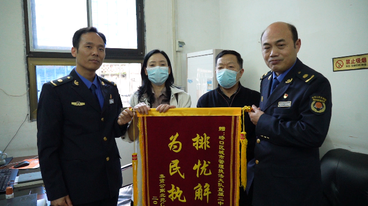 近日,家住硚口区荣华街道集贤公寓北苑的胡女士为区城管执法大队直属二中队送来一面锦旗,向该中队队长熊明章连连道谢。