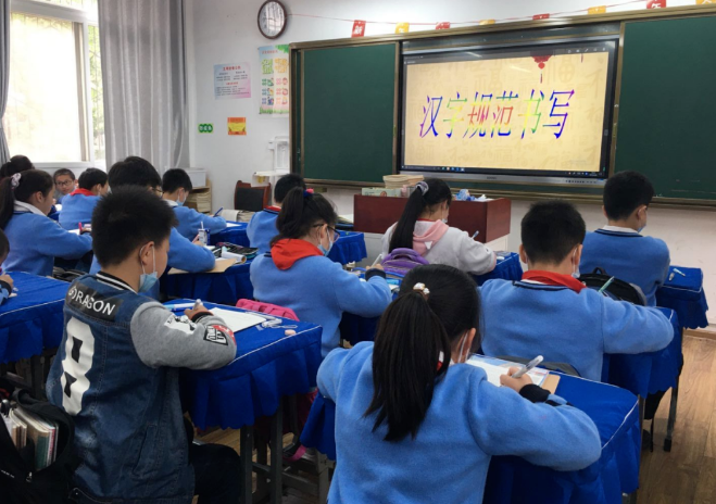 学生们在“党在心中,规范汉字比赛”中,反复练习书写歌颂党的诗歌。