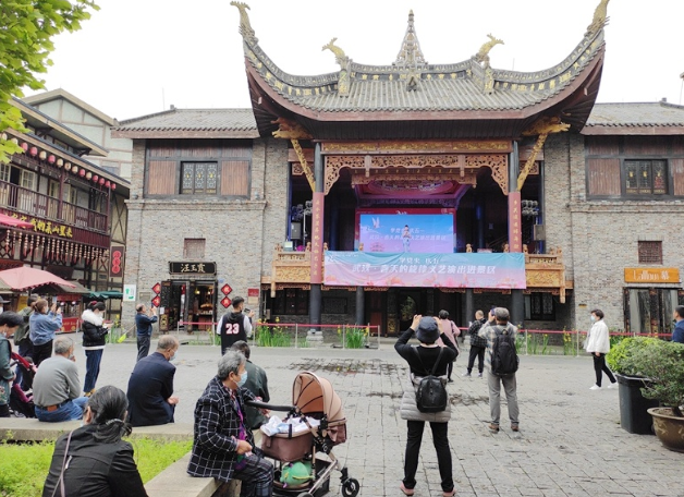 △“学党史·庆五一”武汉春天的旋律文艺演出进景区——戏曲专场在汉口里戏台上演,吸引广大戏曲爱好者前来欣赏。