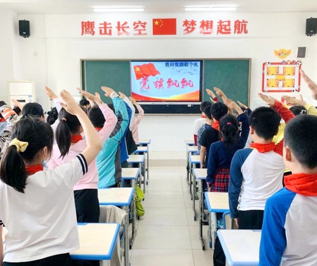 全体学生参加“我向党旗敬个礼”活动,在心中根植“红色种子”。