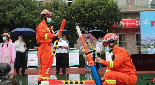 演练结束后,消防员们展示、介绍八类新型消防器材,椭圆形起重气垫等器材引起学生们的兴趣。