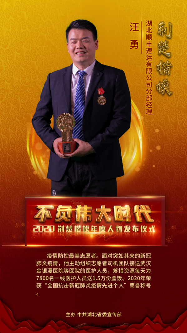 面对突如其来的新冠肺炎疫情,他主动组织志愿者司机团队接送武汉金银潭医院等医院的医护人员,筹措资源每天为7800名一线医护人员送1.5万份盒饭。2020年荣获“全国抗击新冠肺炎疫情先进个人”荣誉称号。