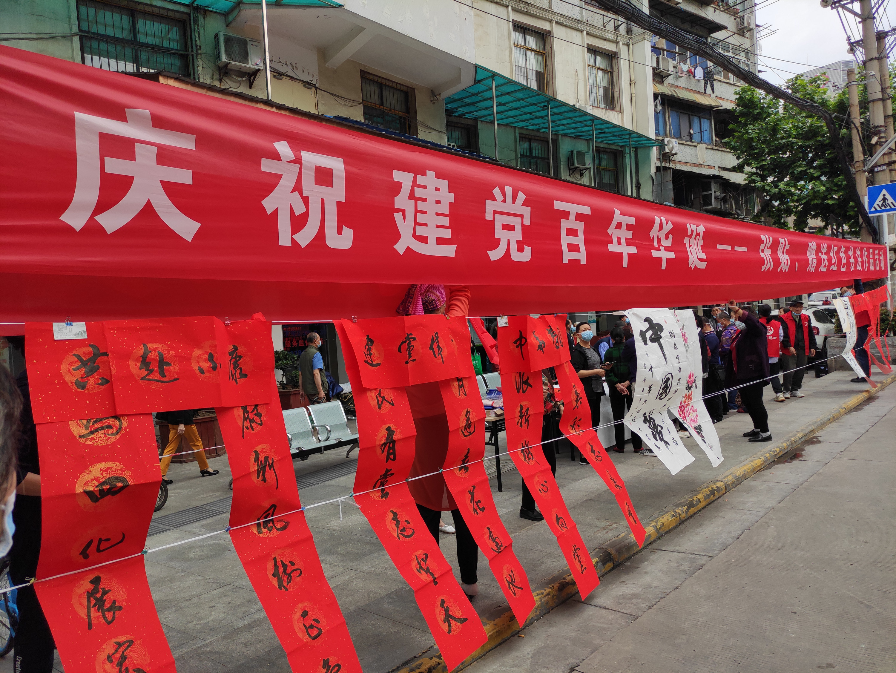“建党伟业”“国泰民安”“学史明理”“学史增信”……书法老师现场创作了一幅幅书法作品,引得路上纷纷驻足观赏。现场完成的书法作品全部赠送给居民和商户,大家挑选后兴高采烈地张贴在大门上,用这样朴实真挚的方式庆祝中国共产党百年华诞。