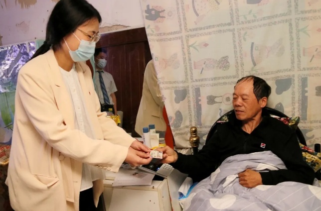 来到杨红财家,志愿者们现场为他讲解业务流程、核对身份信息,看着卧病在床的杨红财在材料上签上自己的名字,在场所有人都露出欣慰的笑容。