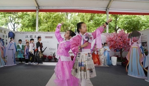行知小学学生用蛇皮袋、废报纸、环保布袋等制成别具特色的“汉服”,成为靓丽风景线。