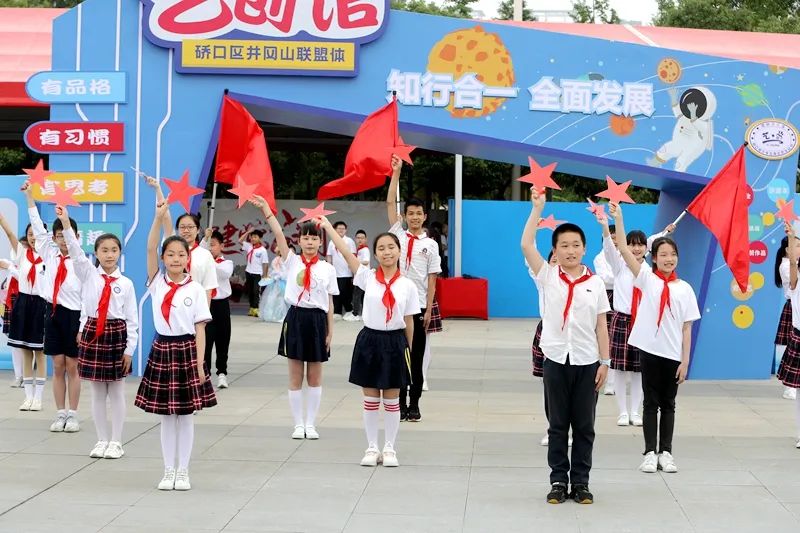 市先进班集体代表、市优秀学生代表、区服务育人先进代表、区优秀班主任代表、区“五有”好少年代表、区优秀学生代表等佩戴红花入场,共同开启硚口区小学“六大联盟体”和硚口区学前教育联盟体设计的七大主题场馆。