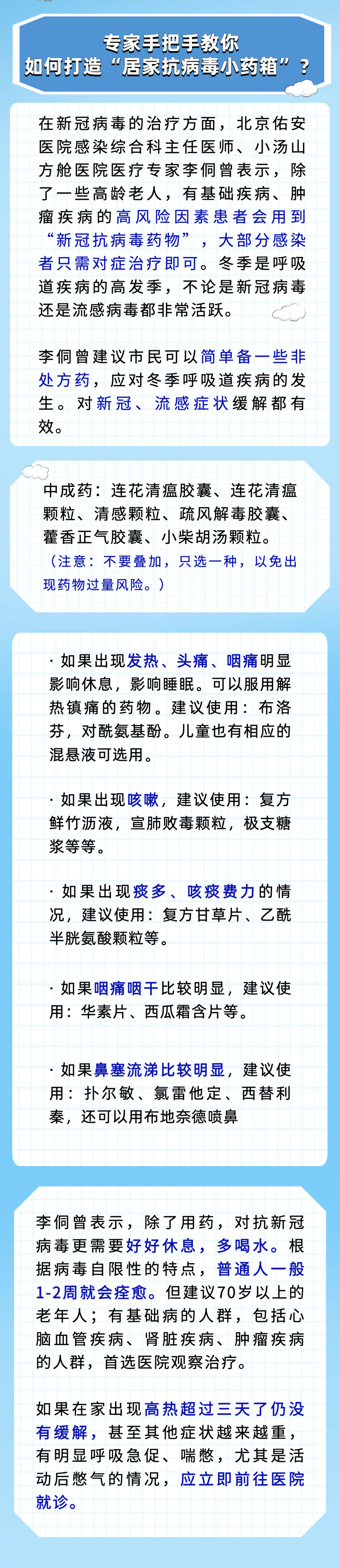 感染新冠病毒后,一般会相继出现哪些症状?到底应该如何科学用药?为应对可能发生的包括奥密克戎BF.7毒株感染在内的呼吸道传染病,大家是否需要提前准备 “居家抗病毒小药箱”?“小药箱”里应该备好哪些药物?12月4日,记者专访了北京佑安医院感染综合科主任医师、小汤山方舱医院医疗专家李侗曾,国家中医医疗救治专家组成员、北京中医医院院长刘清泉。两位专家分别结合《新型冠状病毒肺炎诊疗方案》(第九版)和临床经验,做出了权威、专业的解答。