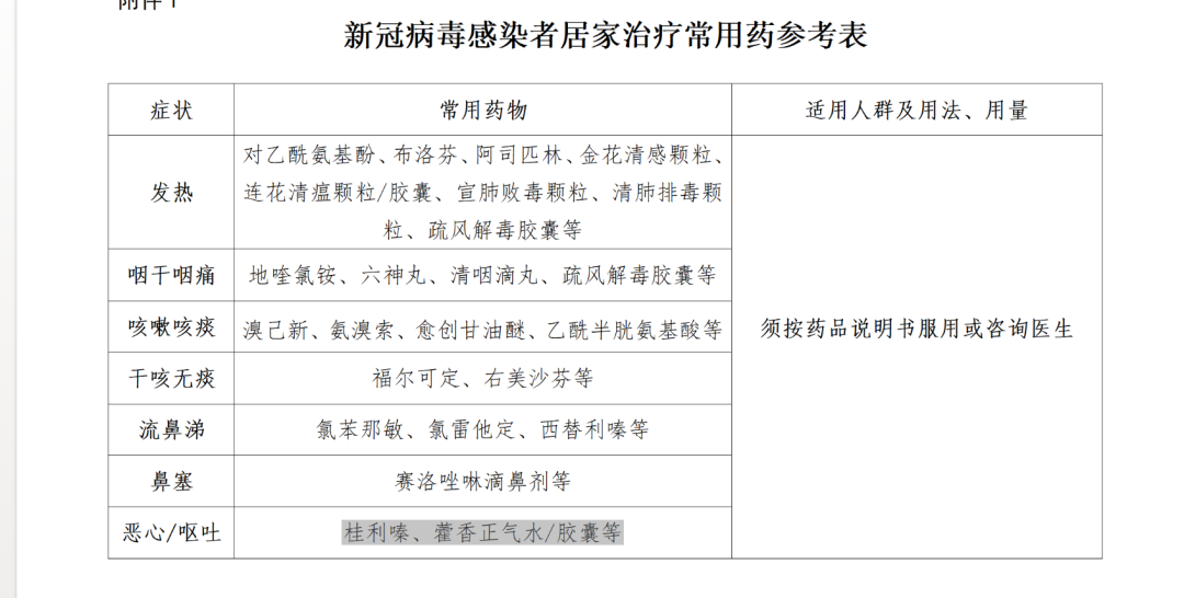 具体来看,如出现发热,对症药物包括对乙酰氨基酚、布洛芬、阿司匹林、金花清感颗粒、 连花清瘟颗粒/胶囊、宣肺败毒颗粒、清肺排毒颗粒、疏风解毒胶囊等;如出现咽干咽痛,对症药物包括地喹氯铵、六神丸、清咽滴丸、疏风解毒胶囊等;如出现咳嗽咳痰,对症药物包括溴己新、氨溴索、愈创甘油醚、乙酰半胱氨基酸等;如出现干咳无痰,对症药物包括福尔可定、右美沙芬等;如出现流鼻涕,对症药物包括,氯苯那敏、氯雷他定、西替利嗪等;如出现鼻塞,对症药物包括,赛洛唑啉滴鼻剂等;如出现恶心/呕吐,对症药物包括,桂利嗪、藿香正气水/胶囊等。