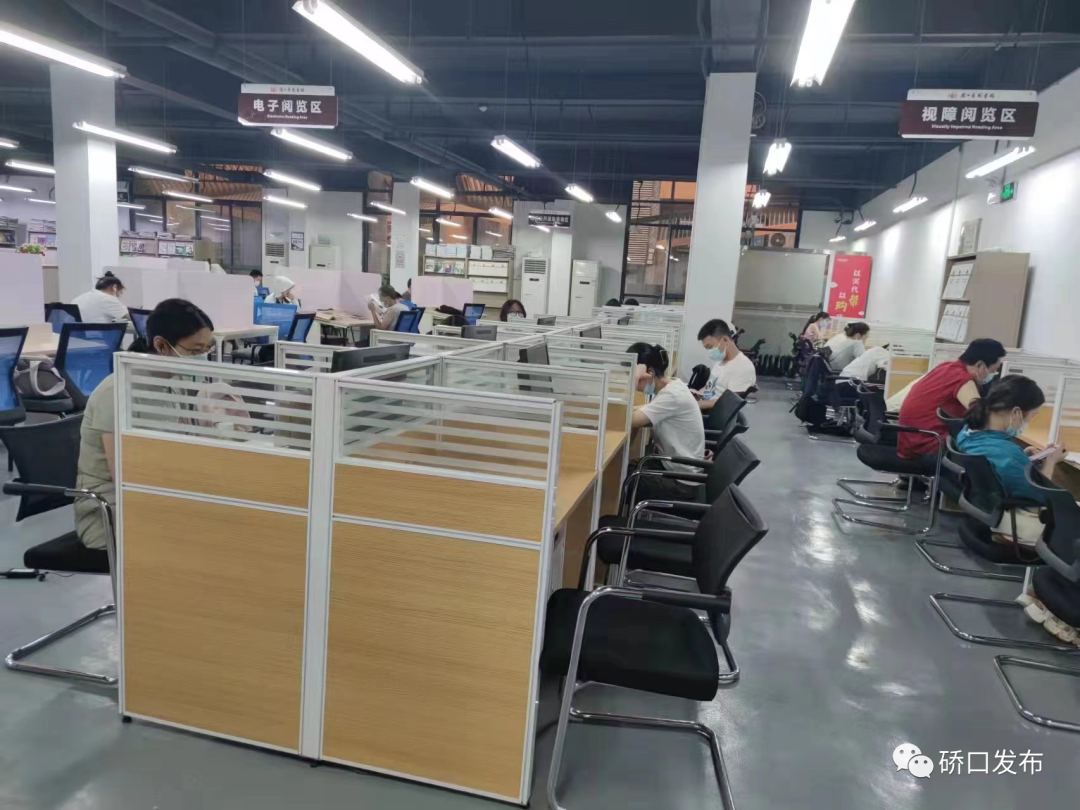 硚口区图书馆主馆面积1659多平米,藏书10万多册,供不应求。报刊阅览区、电子阅览区、成人阅览室、少儿借阅室等各个区域满足不同读者的需求,在角落,两张桌子四把椅子组成的午休区是留给学霸的用餐区。
