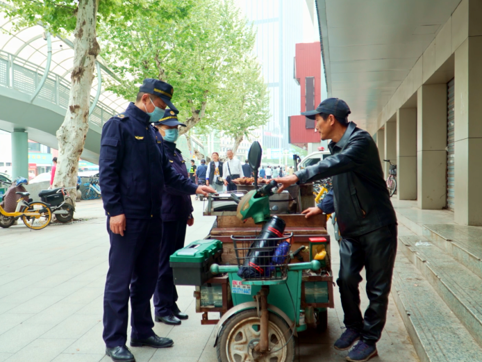 由综合执法队员、市场监督管理员、交警、民政局、公安民警组成的执法处置组,对违反城市市容和环境卫生管理规定的行为,违规经营假冒伪劣商品、涉及食品安全的摊点的行为进行执法。维护交通秩序,妥善安置“当街乞讨”、流浪人员。