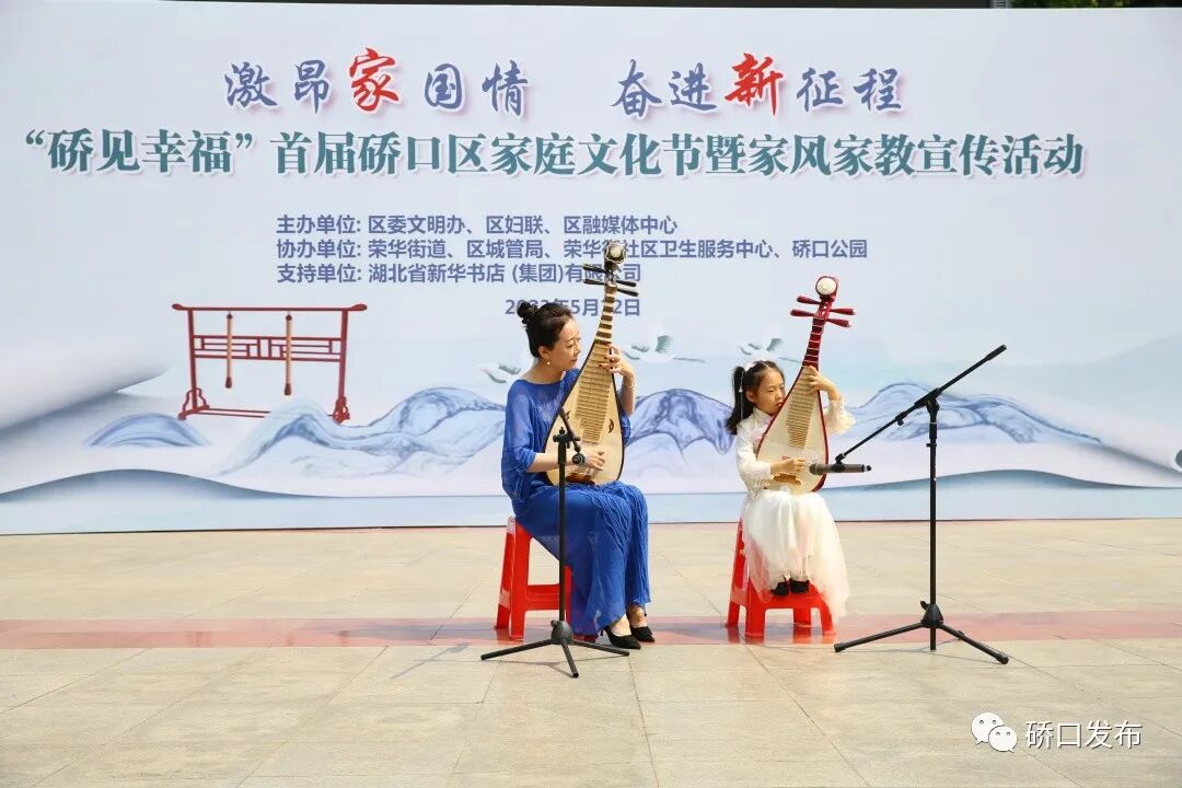 区文化馆老干部王文同志现场表演展示清廉文化书法作品、荣华街爱琳艺术舞蹈队等单位表演的舞蹈《感恩祖国》、独唱《家风》、区教育局推荐的家庭琵琶合奏《你笑起来真好看》等节目收到在场群众广泛好评,迎来阵阵掌声。一场以联动“家”力量,聚力“童”友好为主题的硚口区“硚见幸福”首届家庭文化节暨家风家教宣传活动在精彩的表演中启幕。