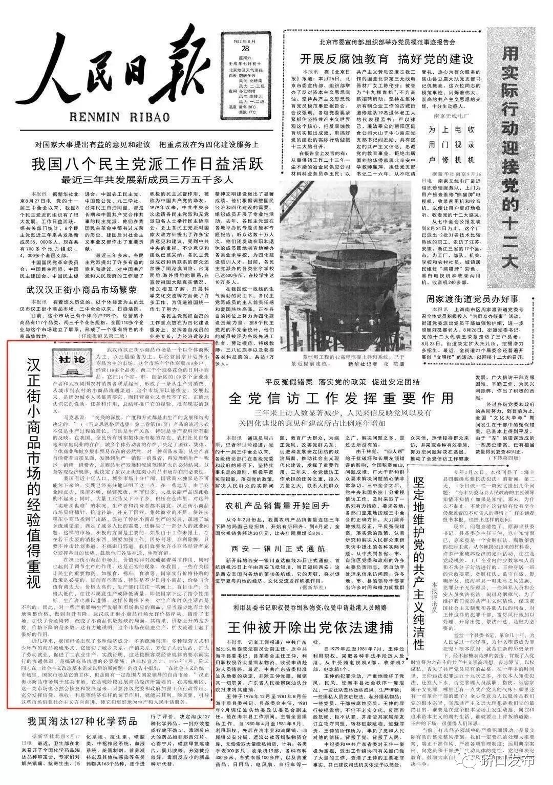 1982年8月28日,《人民日报》发表题为“汉正街小商品市场的经验值得重视”的头版社论,肯定汉正街是中国改革开放的“试验田”和“风向标”,随后进一步发展成为“买全国、卖全国”的小商品交易市场,被商家们誉为“天下第一街”,获得“对外开放看深圳、对内搞活看汉正街”的高度评价。