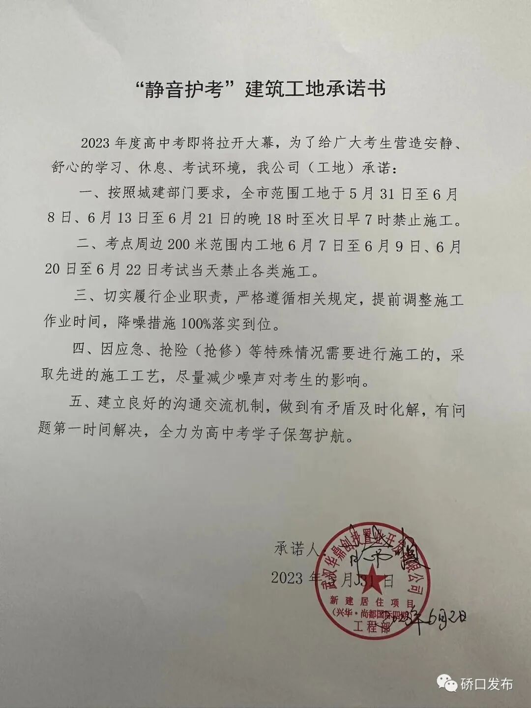 高考临近,硚口城管直属一中队联合辖区全民健身中心项目、金地悦江时代物业,在金地悦江时代小区开展“党员降噪工作室进社区”活动,宣讲《2023年“静音护考”专项行动方案》,督促落实高中考期间停工要求,与项目企业签订《“静音护考”承诺书》,全力做好“静音护考”保障工作。