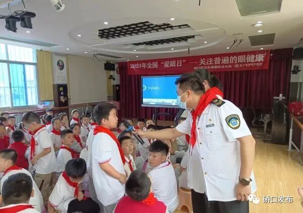 活动现场,同学们为医护和工作人员系上红领巾,他们互敬少先队礼。同学们踊跃举手互动,睁大好奇的双眼,倾听医生的生动讲解,专注地注视屏幕,红领巾与白色制服、白大褂交相辉映。“邢医生,您好!我老是喜欢斜着看黑板或是电视,是不是我的眼睛有问题啊?”星火小学三年级的琪琪同学举起右手,主动提问。