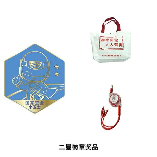 (2)点亮3个基地,可获得“二星安全小卫士”电子荣誉徽章,可兑换国家安全宣传品1份(帆布袋、数据线,共计1000份);