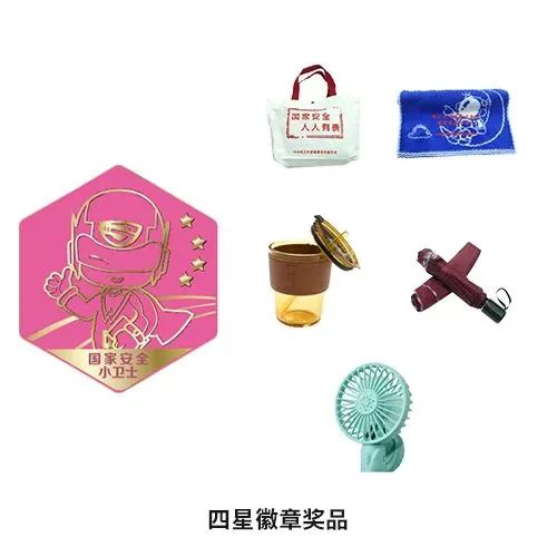 (3)点亮5个基地,可获得“三星安全小卫士”电子荣誉徽章,可兑换国家安全宣传品1份(帆布袋,迷你保温杯、小风扇,共计500份);