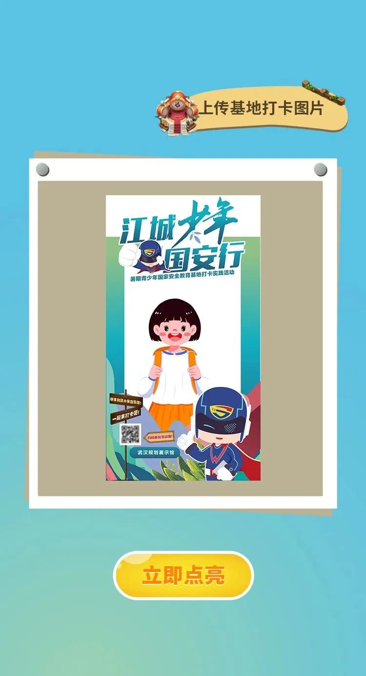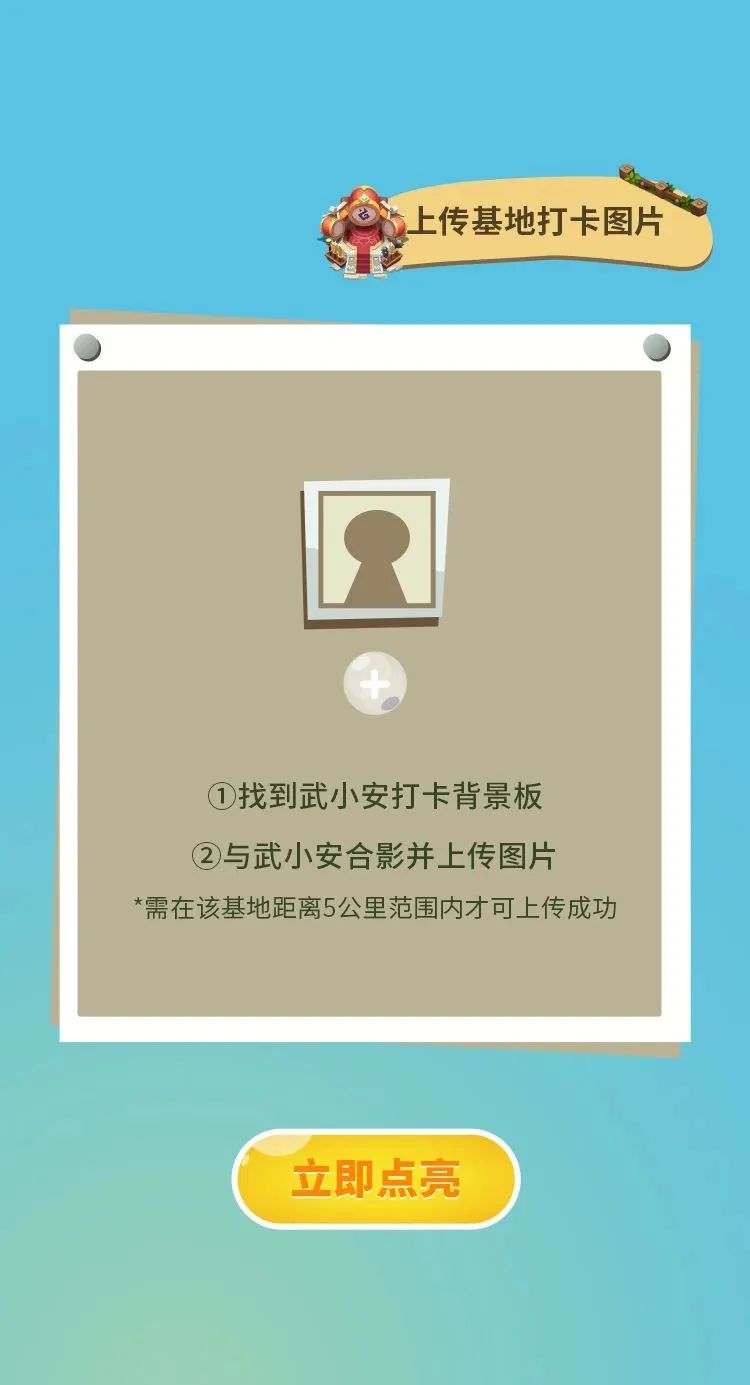 参与者前往任一基地,找到基地内“武小安”活动打卡装置并合照上传。(注意:打卡需在该基地五公里范围内方可上传成功。)