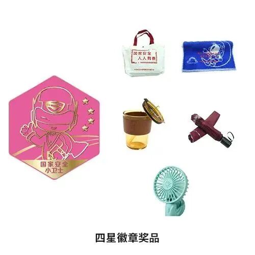 (4)点亮8个基地,可获得“四星安全小卫士”电子荣誉徽章,可兑换国家安全宣传品1份(帆布袋、毛巾、咖啡杯、雨伞、小风扇,共计200份)。