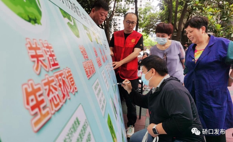 6月5日,六角亭街道荣东社区举办主题为“建设人与自然和谐共生的现代化 打造美丽生态硚口”的宣传活动。生态环境宣传、共创“无废社区”群众签名、环保问题答疑解惑、环境监测装备展示等四个项目,吸引众多市民参与。