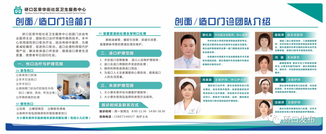 硚口区荣华街社区卫生服务中心创面造口门诊的开设,对处理各种急性伤口如擦伤、烫伤、挤压伤、各种手术后换药及拆线,术后引流管伤口的处理;对处理慢性伤口包括各种压疮、下肢动静脉溃疡、糖尿病足溃疡等,及各种伤口造口及其周围皮肤并发症,采用新的伤口湿性愈合理论,减轻患者疼痛、加速伤口愈合、缩短换药周期,为患者提供系统治疗及专业化的优质服务。