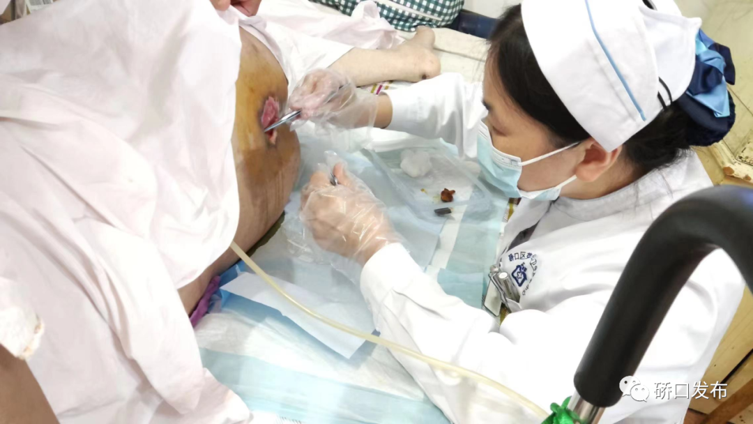 郑婆婆,78岁,患阿兹海默症三年,今年4月23日家属找到门诊诉说婆婆骶尾部皮肤发黑,经肖泉英护士长检查发现,8*10cm黑色坏死交加,为不可分期压力性损伤,评估患者压疮的高危因素,制定护理计划,更换气垫床,示范翻身动作,避免拖拉硬拽,加重病情,指导患者家属饮食方面给予高蛋白饮食,通过两天的治疗,伤口上面的黑色痂皮慢慢软化,坏死组织深达骨骼,确定是四期压力性损伤,需要住院治疗,立即联系武汉市一医院创面修复科。通过一个月的治疗患者回到社区继续治疗,创面还有10*8*2厘米的“大洞”,需要处理。之后肖泉英护士长及她的创面门诊护理团队每天隔日上门处理伤口,检查护理翻身情况,饮食情况伤口一步一步往好的方向在发展,让患者和家属倍感温暖。