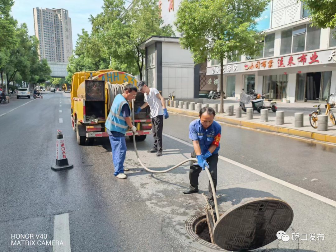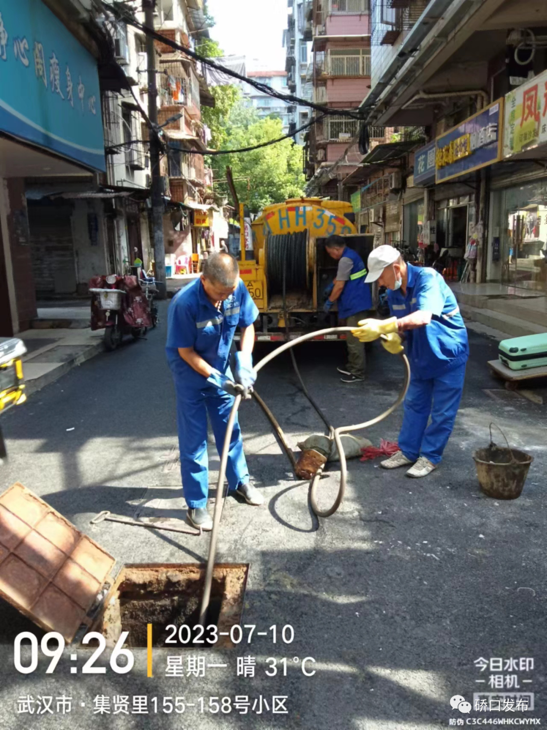 高温下,道路上,硚口水务人头顶烈日,脚踩热浪,开展清淤疏浚、江滩管护和二次供水改造工作。下水管道空间局促、密不透风,师傅拿着一把小铲,将附着在管道内壁上的淤泥去除,等他从井里上来的时候早已大汗淋漓。炎炎夏日,衣服湿了干、干了湿都是常态,从清晨到夜晚,硚口水务人的身影一直都在。