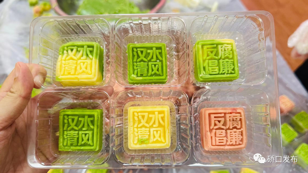 活动最后,在场人员一起制作绿豆糕,在模具上为大家印制了汉水清风、忠诚担当、青年清廉、反腐倡廉等字样,希望大家在做糕点、品尝夏日清凉的同时,看到上面的廉洁字样,能够时刻警醒自己,保持坚定的理想信念,砥砺严肃的生活作风,培养健康的生活情趣,防止歪风邪气近身附体,最终行稳致远、有所作为。