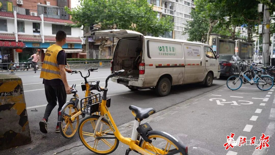 ▲美团单车运维人员袁胜正在六十四中门口清运车辆