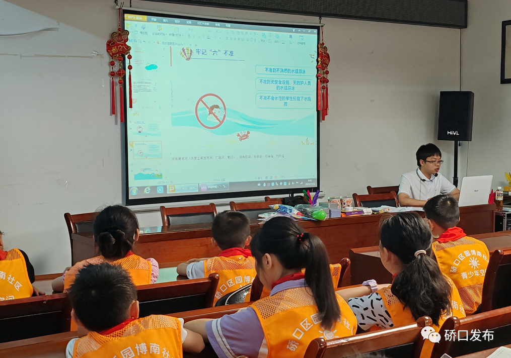 园博南社区志愿者用生动形象的语言向小朋友们宣传防溺水知识,播放了防溺水动画短片,告诉学生不私自结伴到水边玩耍,一定要由家长陪同到正规游泳池游泳。如有人溺水时避免手拉手盲目施救,应采用智慧救援,并立即寻求成年人帮助,坚决做到防溺水“六不准”。