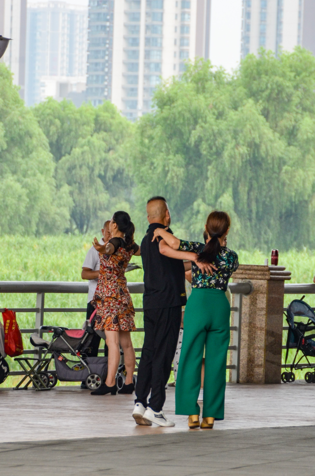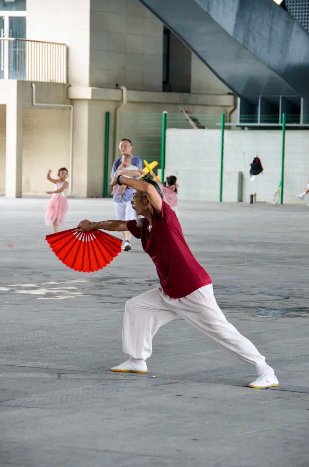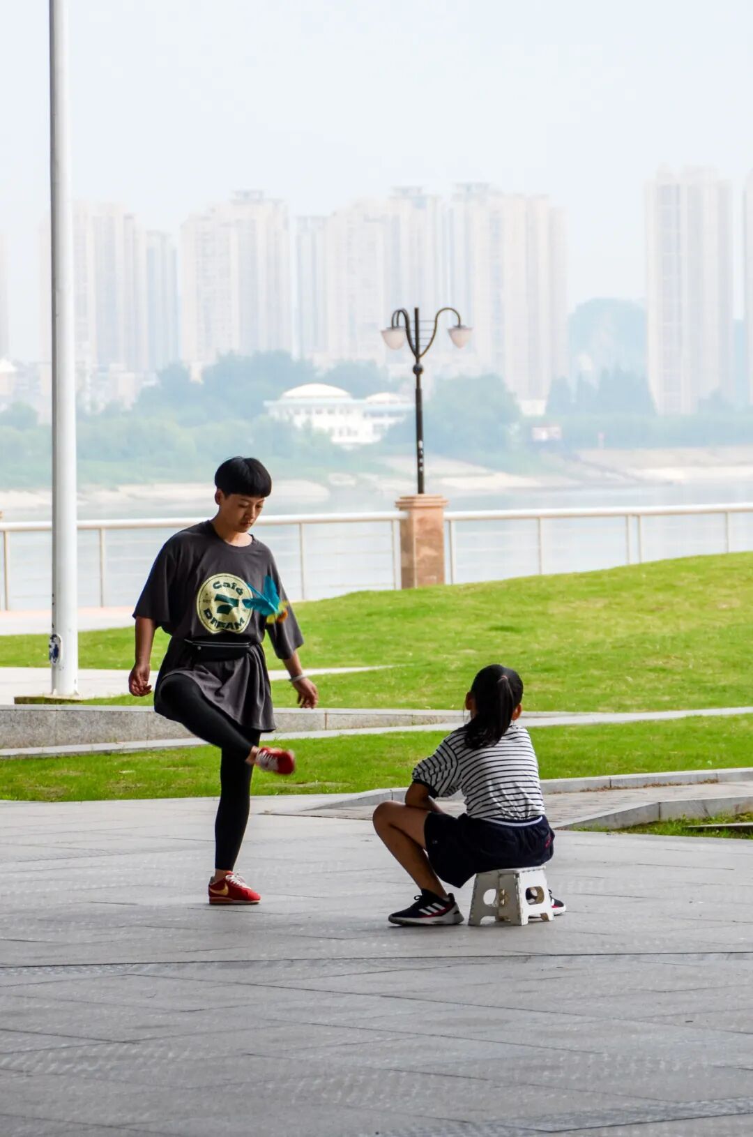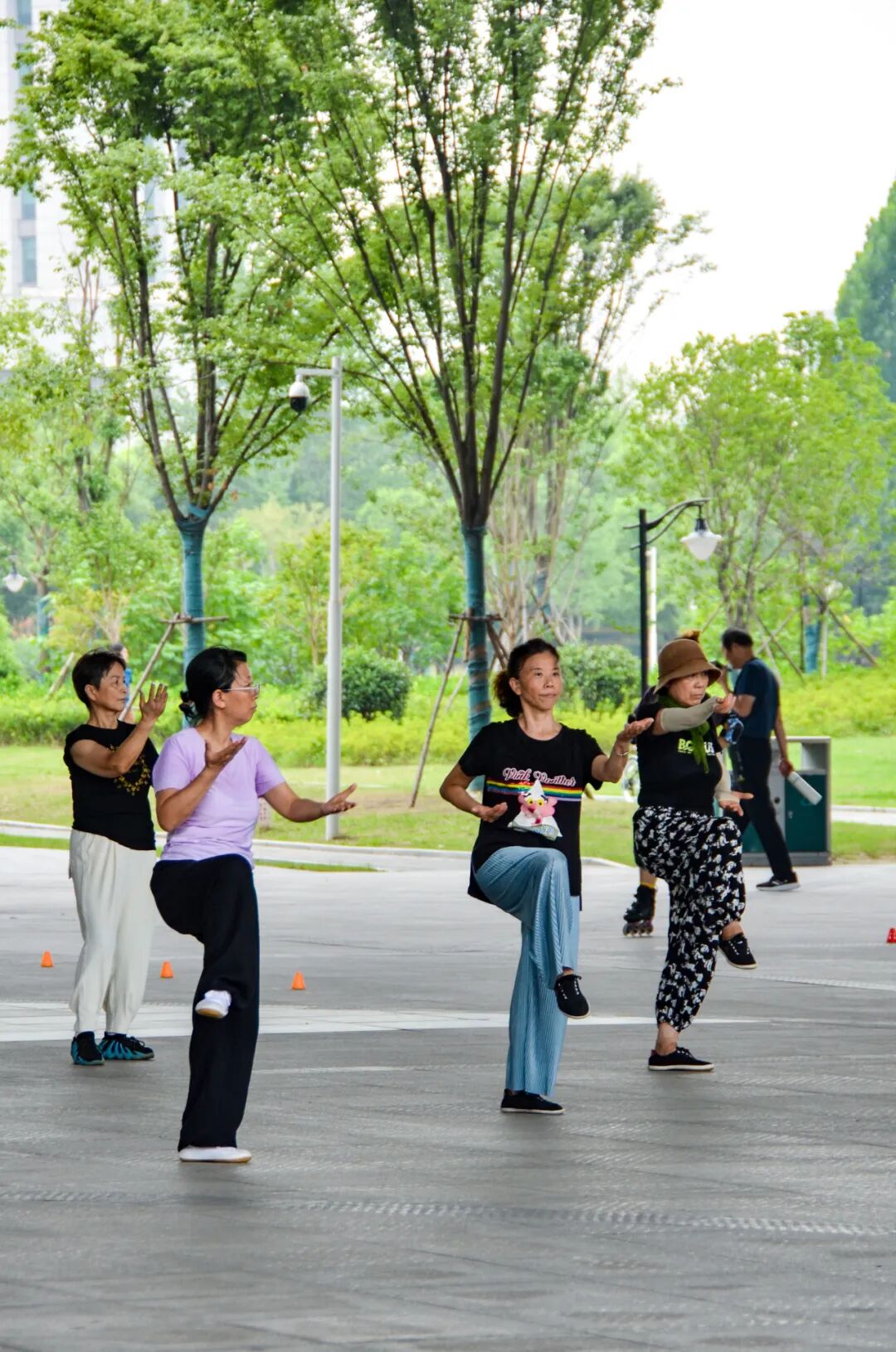 来到汉江湾桥下的七巧广场,可谓是热闹非凡。打太极和练武术的叔叔阿姨们各成一派,周边还有滑旱冰、踢毽子、写地书、舞蹈、跳绳等多项运动休闲活动火热进行。