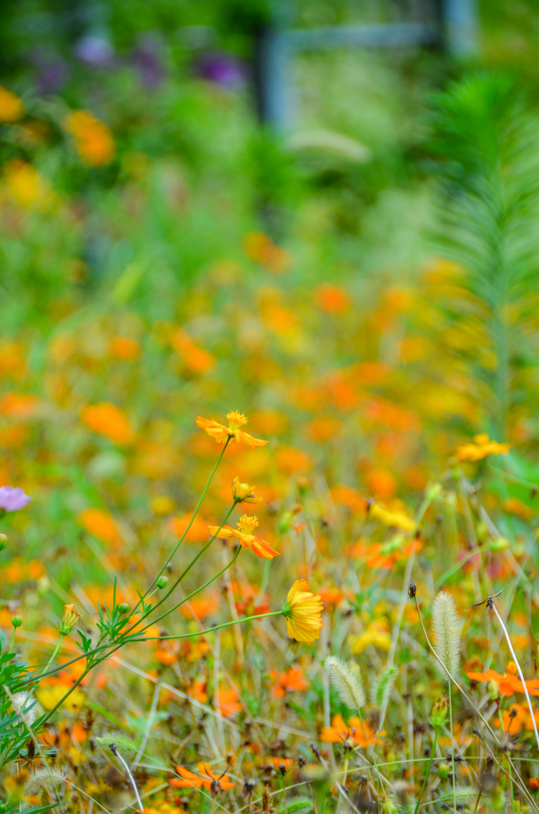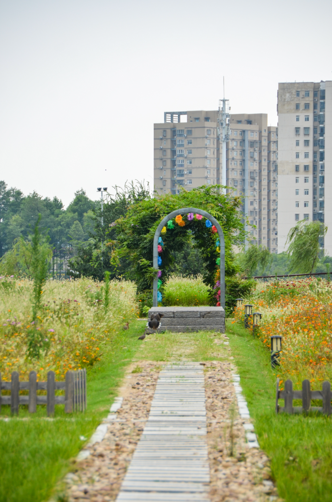 蓝桥下方不远处,还有一片花海,种植着硫华菊、百日草、柳叶马鞭草等花卉。目前虽已经过了盛放季节,仍旧有不少花儿还努力开着。
