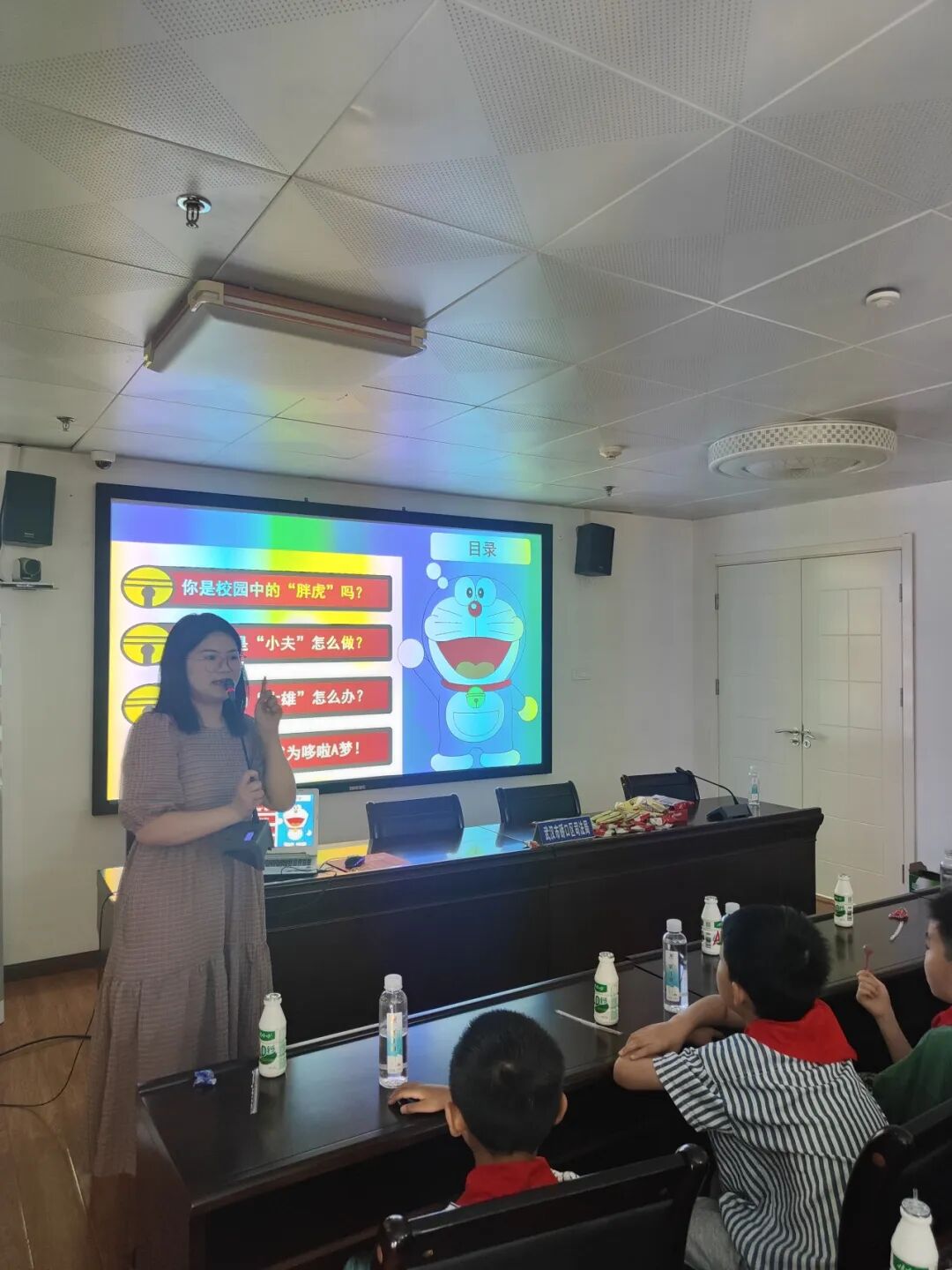 最后,由“新时代文明实践法律服务队”的志愿者为孩子们带来一节精彩纷呈的普法宣传讲座。普法志愿者围绕“防止校园霸凌”主题,结合法治动漫视频,深入浅出、寓教于乐,引导孩子们发现身边的校园霸凌现象,并学会用法律的武器保护自己,用法治呵护他们健康快乐茁壮成长。课堂现场气氛热烈,孩子们纷纷举手抢答问题,与志愿者互动,乐在其中、学在其中,带着法治知识满载而归。