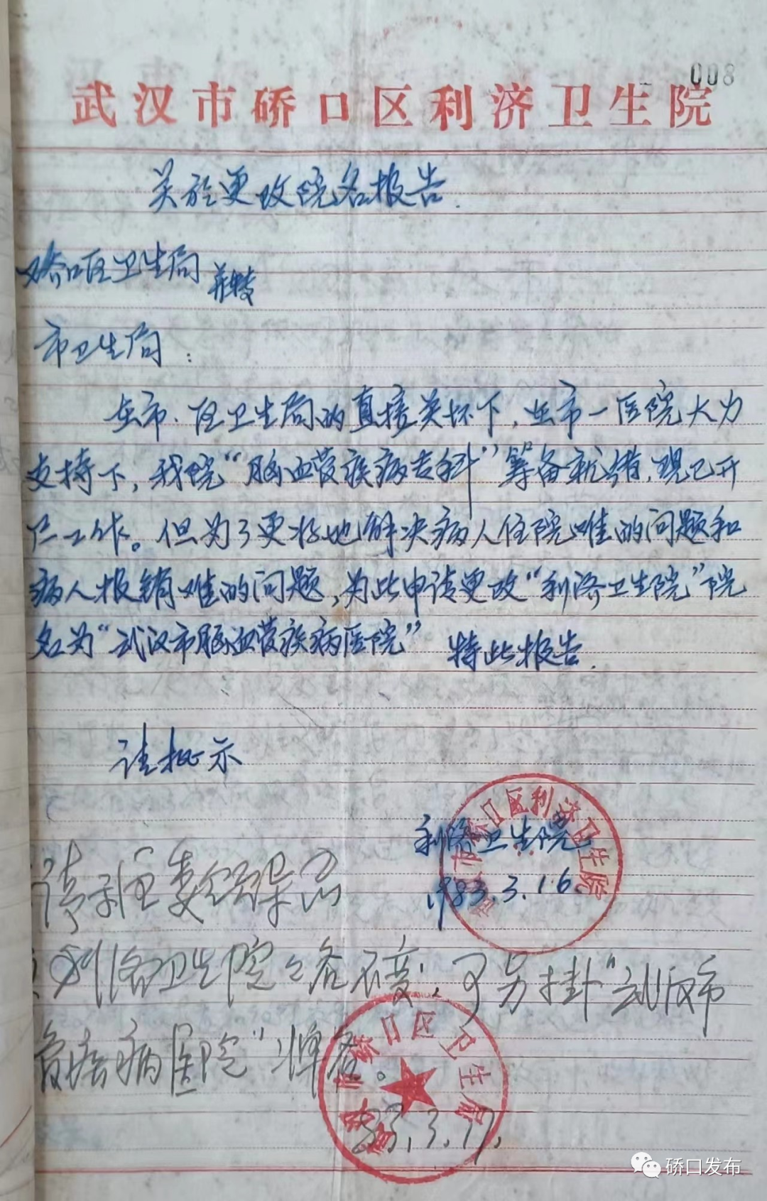 1958年,新组建的利济妇幼保健站落户于此,利济联合诊所顺应发展需要,经上级主管部门批准,更名为“硚口区利济卫生院”。